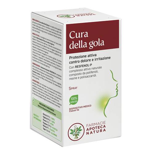 Cura della golaDescrizione Dispositivo medico specifico per gli stati irritativi della gola. È indicato per il trattamento del mal di gola che può essere causato da virus, batteri, allergeni o dal contatto con agenti esterni irritanti (fumo, smog, polvere). Il prodotto è adatto anche negli stati di raffreddamento dove le secrezioni nasali, scendendo nella gola, possono essere causa di irritazione. Cura della gola spray allevia dolore, bruciore, difficoltà di deglutizione e secchezza del cavo orofaringeo attraverso un meccanismo protettivo e antinfiammatorio indiretto come risultato delle azioni barriera, antiossidante e idratante...